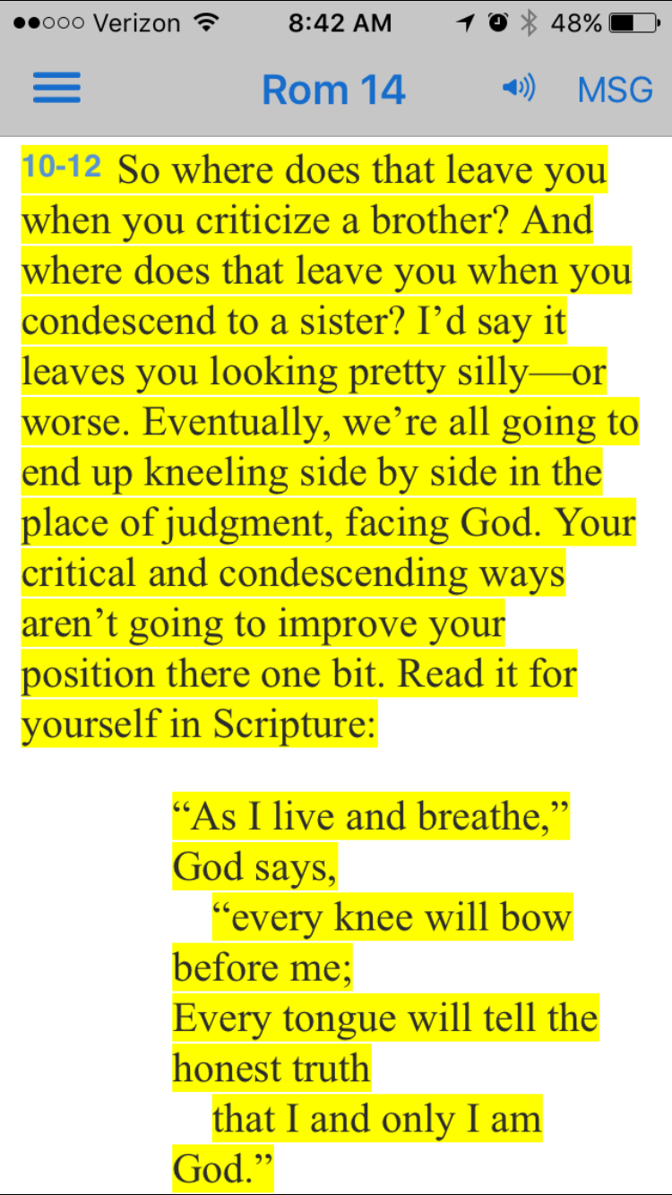 5 One person esteems one day above another; another esteems every day alike. Let each be fully convinced in his own mind. 6 He who observes the day, observes it to the Lord;[a] and he who does not observe the day, to the Lord he does not observe it. He who eats, eats to the Lord, for he gives God thanks; and he who does not eat, to the Lord he does not eat, and gives God thanks. 7 For none of us lives to himself, and no one dies to himself. 8 For if we live, we live to the Lord; and if we die, we die to the Lord. Therefore, whether we live or die, we are the Lord’s. 9 For to this end Christ died and rose[b] and lived again, that He might be Lord of both the dead and the living. 10 But why do you judge your brother? Or why do you show contempt for your brother? For we shall all stand before the judgment seat of Christ.[c] 11 For it is written: